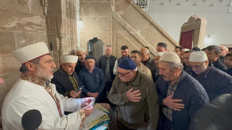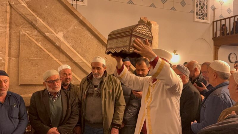 Tarihi Yunuspaşa Camii’nde kılınan teravih namazı sonrası çıkarılan ve 63 parça beze sarılı Sakal-ı Şerif, dua ve salavatlar eşliğinde ziyaret alanına getirildi.